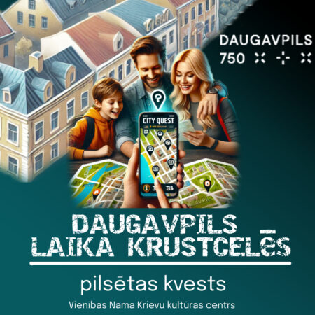 DALL·E 2025-03-20 13.54.08 — An advertisement for a city quest in Daugavpils. The image features a smartphone displaying a map with marked quest locations. A family of three—a man
